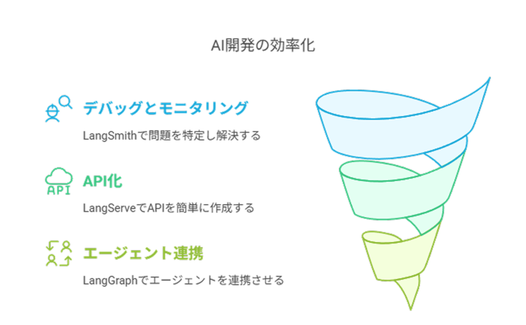 また、LangSmithでのデバッグやLangServeによるAPI化も容易になり、AIアプリケーション開発の敷居を下げています。