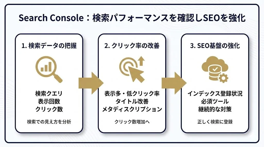 | Google Search Console | 検索パフォーマンスの分析 | 検索キーワード、表示回数、クリック数、検索順位 |