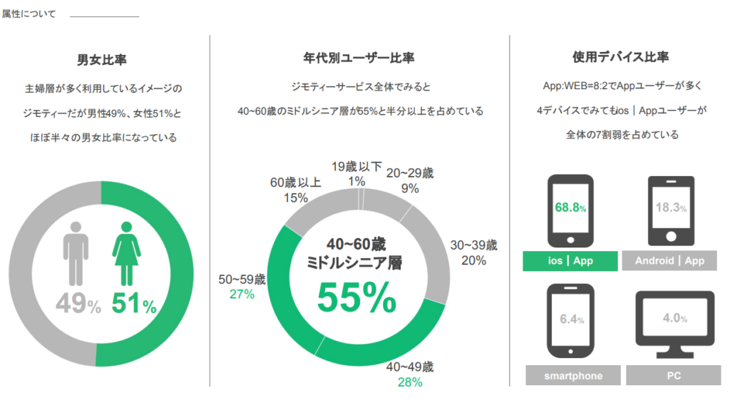 ジモティーのユーザー層には明確な特徴があります。年代別では40〜60歳のミドルシニア層が全体の55%を占めており、比較的年齢層が高いメディアです。一方、男女比は男性49%・女性51%とほぼ半々で、主婦層が多いイメージとは異なり、性別に偏りはありません。