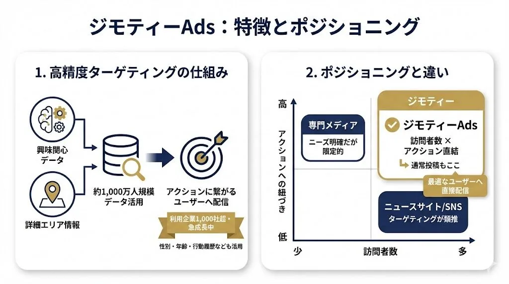 専門メディアはアクションに繋がるユーザーが訪れるものの、訪問者数が限られます。一方、ニュースサイトやSNSは訪問者数は多いものの、コンテンツが直接アクションに紐づかないためターゲティングが類推になりがちです。ジモティーは訪問者数の多さとアクションへの紐づきを両立しており、この特性がジモティーAdsの高い広告効果を支えています。