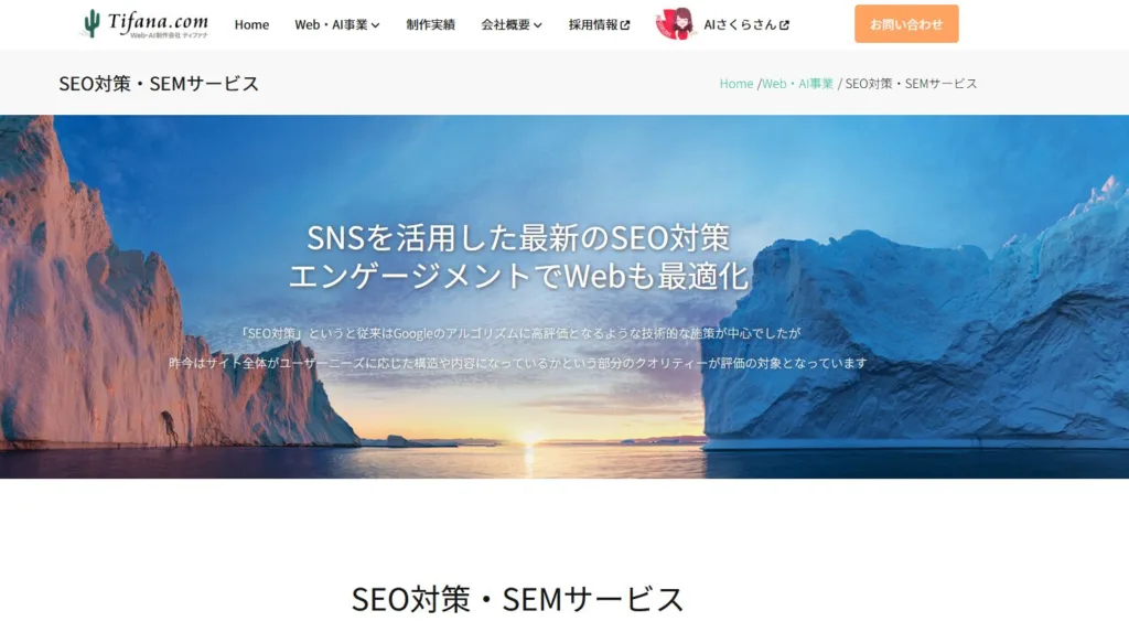 | 特徴 | ・独自の「ティファナSEOアルゴリズム」で1000サイト超の実績 ・AI事業「AIさくらさん」でも知られる ・ISO9001、ISO27001など国際認証取得 |