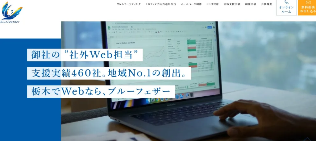 ブルーフェザー株式会社は、栃木県小山市に本社を構え、東京にも事業所を持つWebマーケティング支援会社です。リスティング広告運用代行を最も得意としつつ、SEO対策やコンテンツマーケティング支援、MEO対策にも幅広く対応しています。