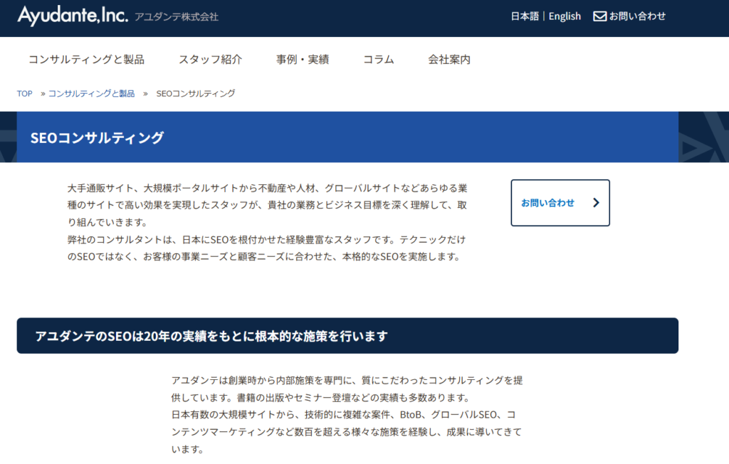 アユダンテ株式会社は、千代田区麹町に本社を置く2006年創業の老舗SEO対策会社です。日本にSEOを根付かせたコンサルタントが在籍しており、業界最高レベルの知見を持つプロフェッショナル集団として知られています。