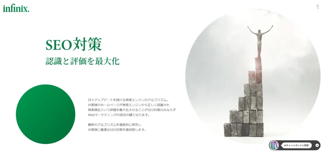 株式会社インフィニックスは、千代田区内神田に拠点を置くSEO対策とWebマーケティングの専門会社です。検索順位向上だけでなく、サイト流入からコンバージョン改善まで一貫したサポートを行っています。