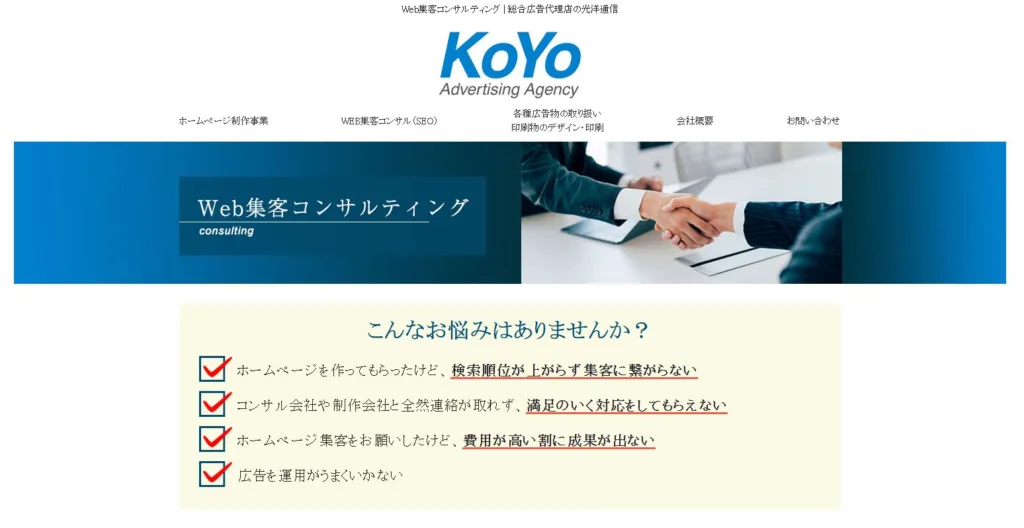 株式会社光洋通信は、1985年設立の老舗広告代理店です。マスメディア広告の企画・制作からWebマーケティングまで幅広く手がけており、SEO対策や集客コンサルティングにも対応しています。